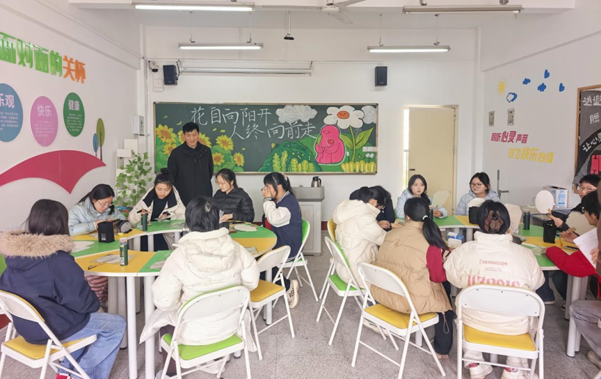 活动当天,团辅活动室内气氛温馨热烈。学院党支部副书记葛振亚来到现场与同学们进行亲切交流并表示,心理健康是成长路上的重要基石,希望同学们在忙碌的学习生活中,也能找到属于自己的“心灵栖息地”。心理辅导员周聪老师全程参与,细心观察同学们的创作状态,引导大家将抽象的情绪转化为具象的色彩与线条。周笑影老师与同学们积极互动,用真诚的鼓励传递温暖与力量。